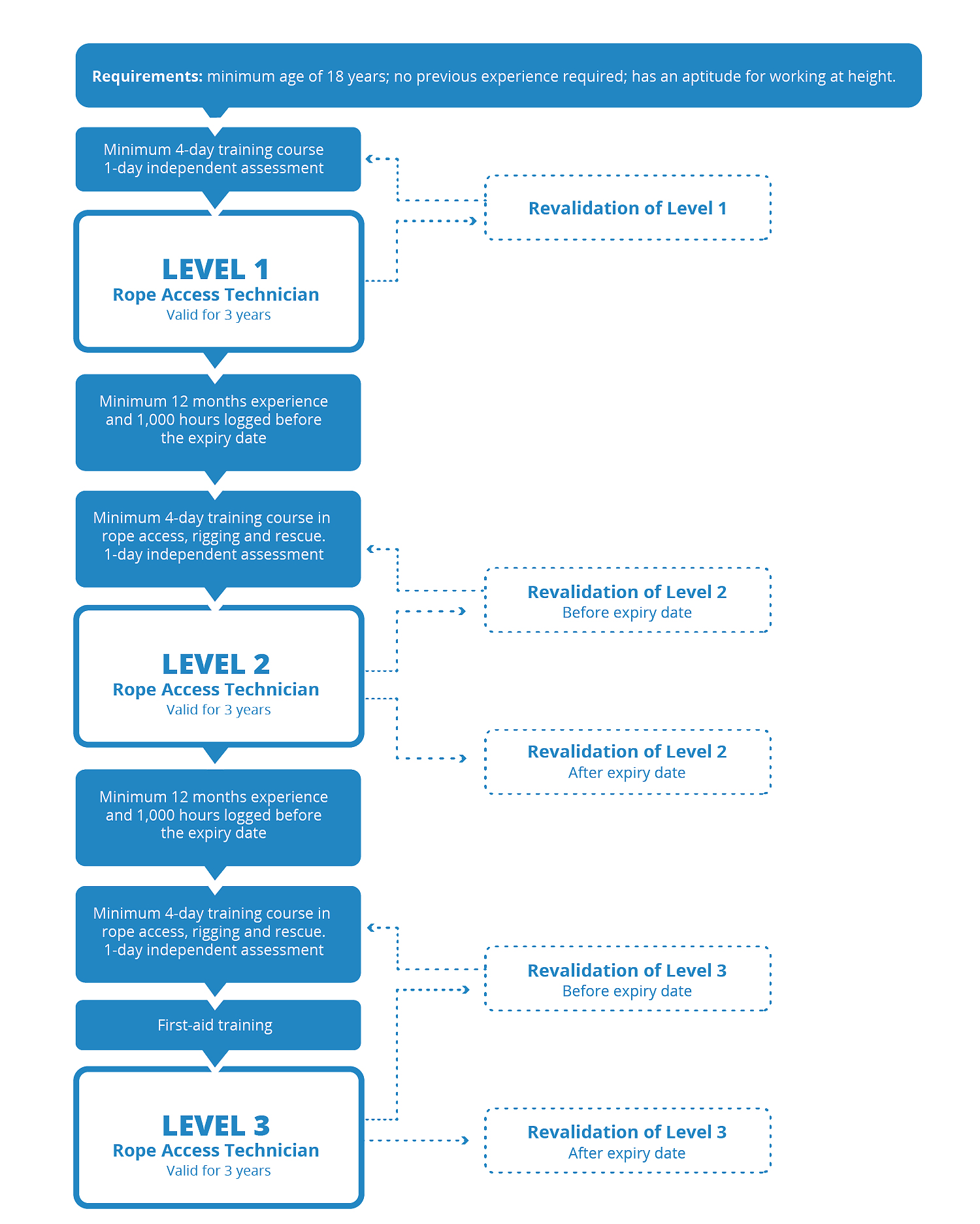 In order to ensure a safe work environment, candidates must have an appropriate attitude alongside fitness and physical capabilities. An appraisal can be arranged with a TMC if unsure. Rope access work is often remote and far from outside help, meaning a respect for heights and responsible behaviour is required to prevent any incidents. TMCs have the right to exclude any candidate from training if they have concerns over their fitness or attitude. Candidates also need to be at least 18 years of age.